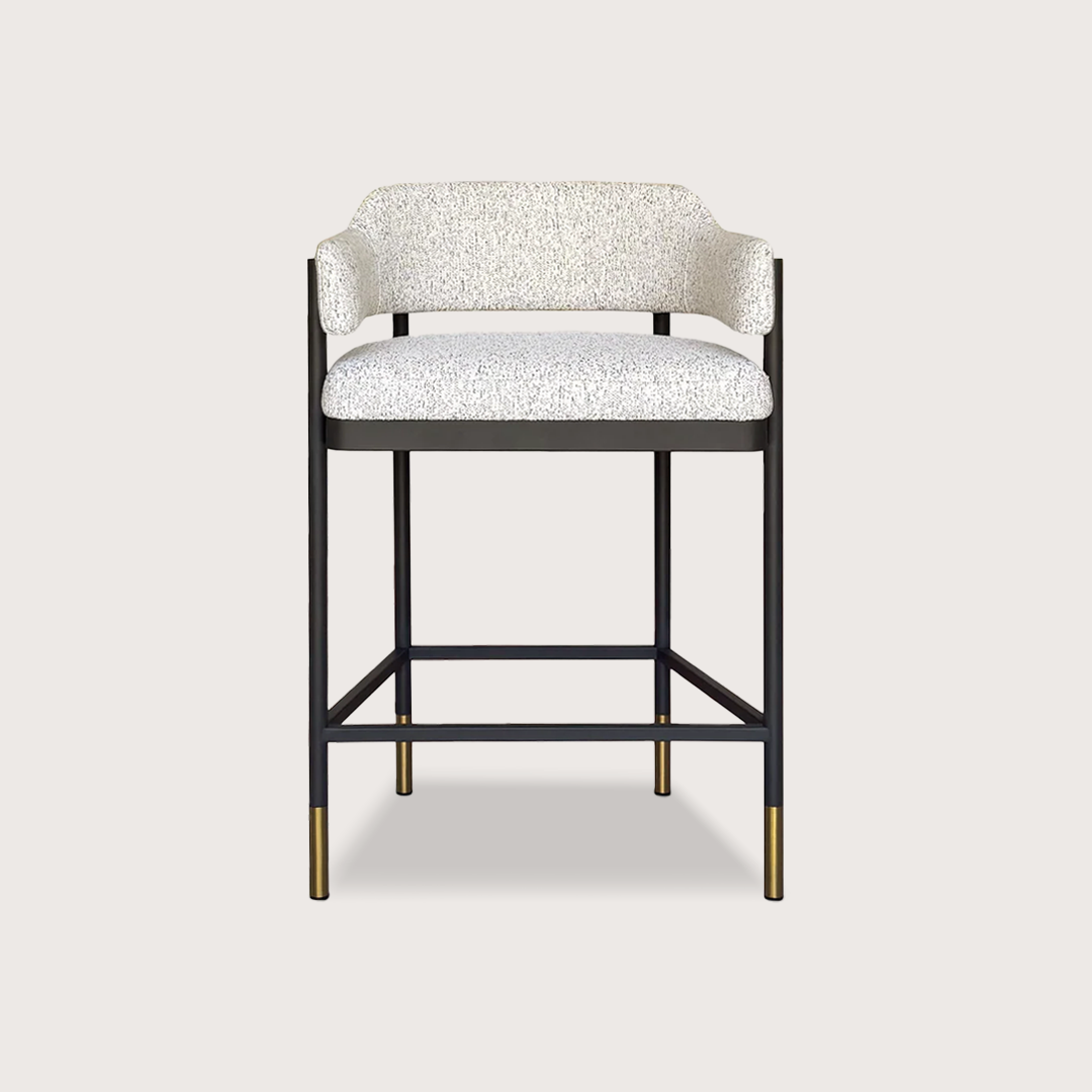 Elevate your dining space with the Santi Barstool, a perfect fusion of contemporary chic and comfort. Its curved open back features a dark graphite iron coated frame with brushed brass accents, adding a luxurious touch. Upholstered in a light tonal beige tweed, it combines style with warmth.