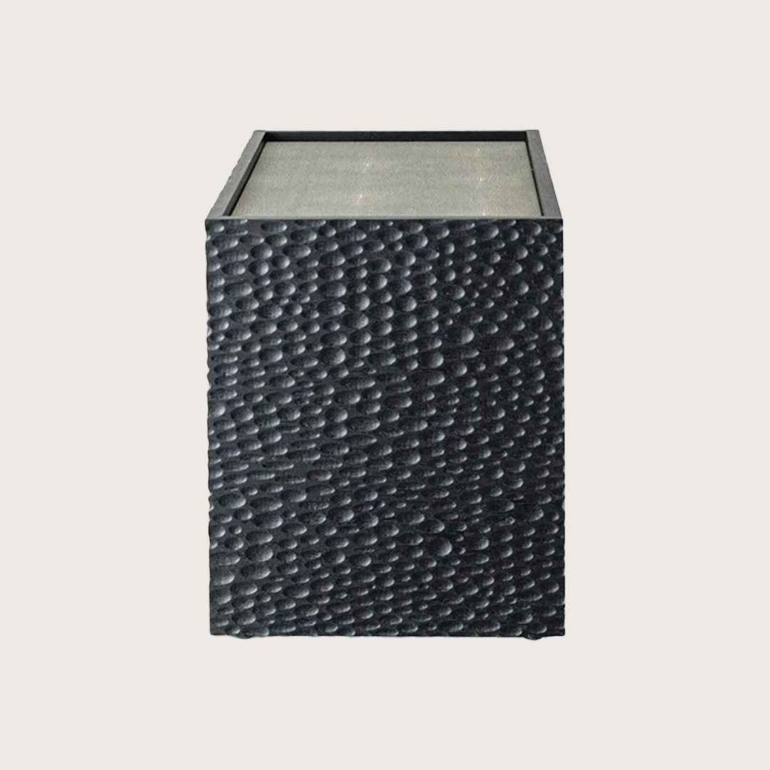 Introducing the Andre Bedside Table a harmonious blend of modern elegance and functionality. Crafted with precision from solid oak, with a black textured timber and a shagreen embossed finish top exudes sophistication. The brass-handled drawer provides ample storage, effortlessly combining style with practicality. Elevate your bedroom with the Andre Bedside Table.