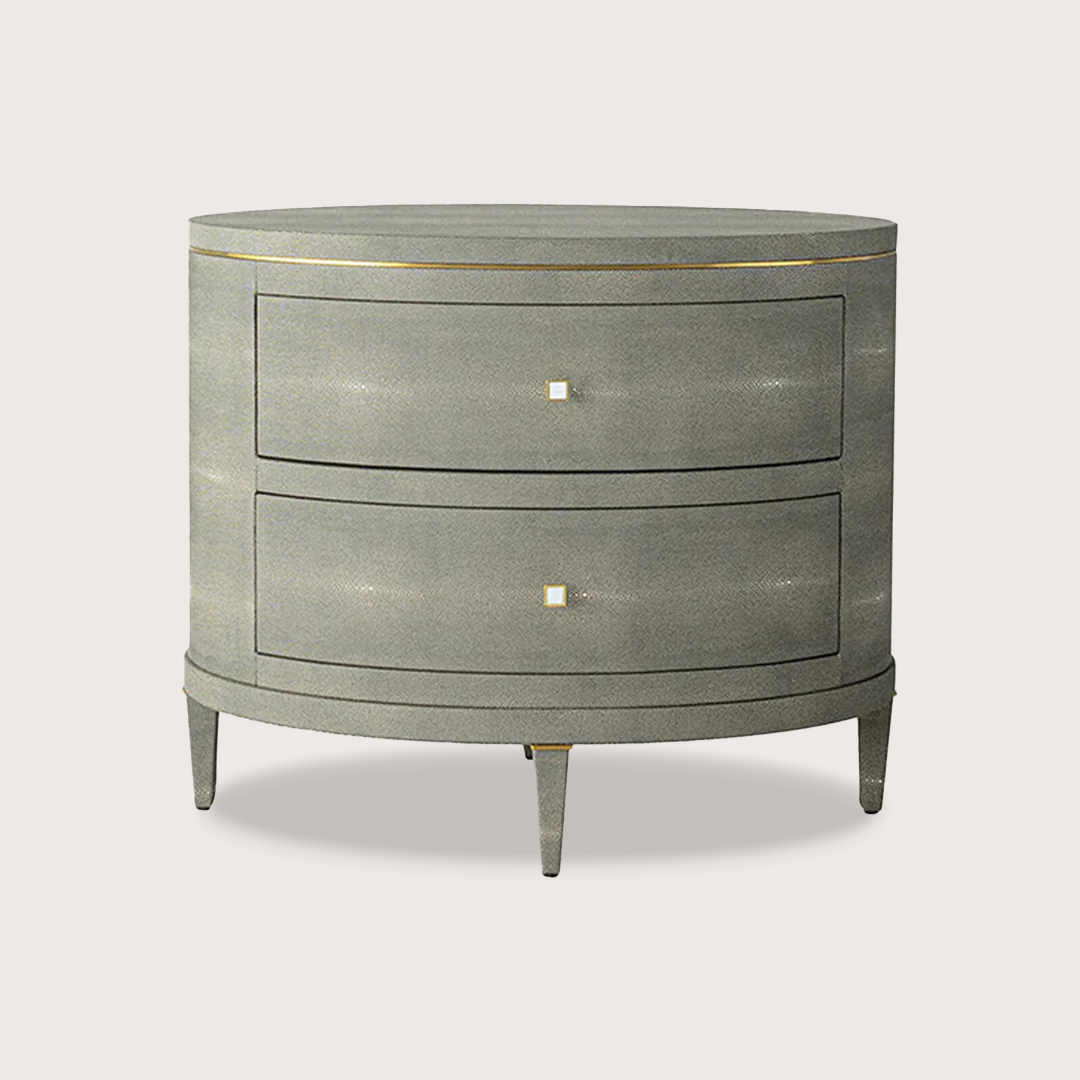 Meet the epitome of refined elegance the Odette Bedside Table. This exquisite piece seamlessly blends tactile sophistication with practical design. Immerse yourself in the luxurious shagreen embossed finish, meticulously crafted to elevate your bedroom aesthetics. Enhanced by brushed gold linings, this bedside table exudes opulence and sophistication. With its distinctive oval-shaped silhouette and two drawers for seamless storage, the Odette Bedside Table redefines the essence of bedside luxury. Elevate your bedroom ambiance with this distinctive piece, where artistry and functionality converge seamlessly.