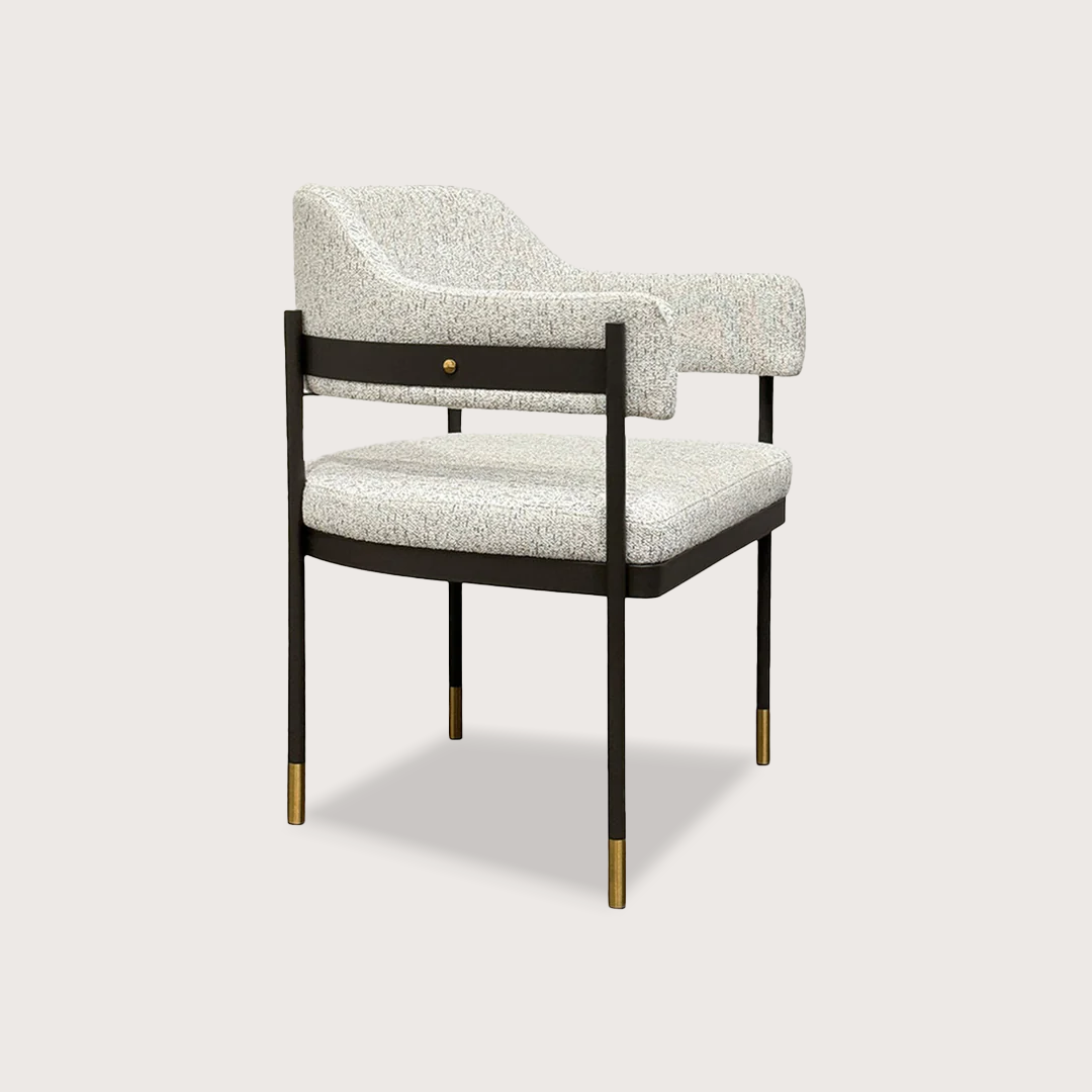 Elevate your dining space with the Santi Dining Chair, a perfect marriage of contemporary chic and comfort. Its curved exposed back features a black iron coated frame with brushed brass accents, adding a luxurious touch. Upholstered in tonal beige tweed, it combines style with warmth.