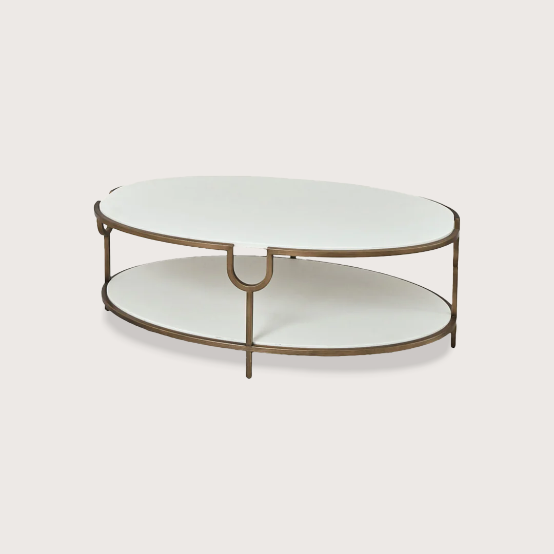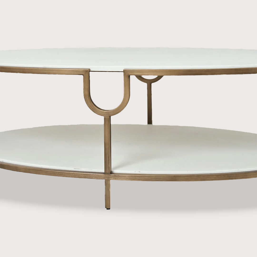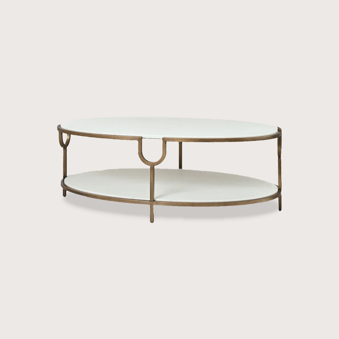 Introducing the Raya Coffee Table, a sleek statement piece for your living space. The table boasts an artificial stone pure matt white top that exudes modern simplicity, elegantly paired with an iron base powder-coated in a lustrous brass finish. Elevate your decor with the Raya Coffee Table, where contemporary design meets durable craftsmanship for a touch of sophistication.