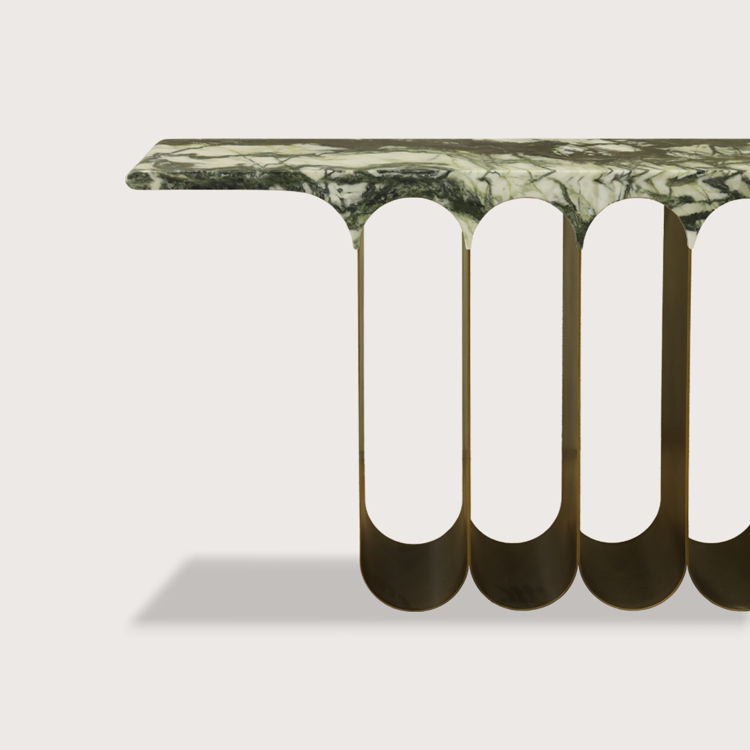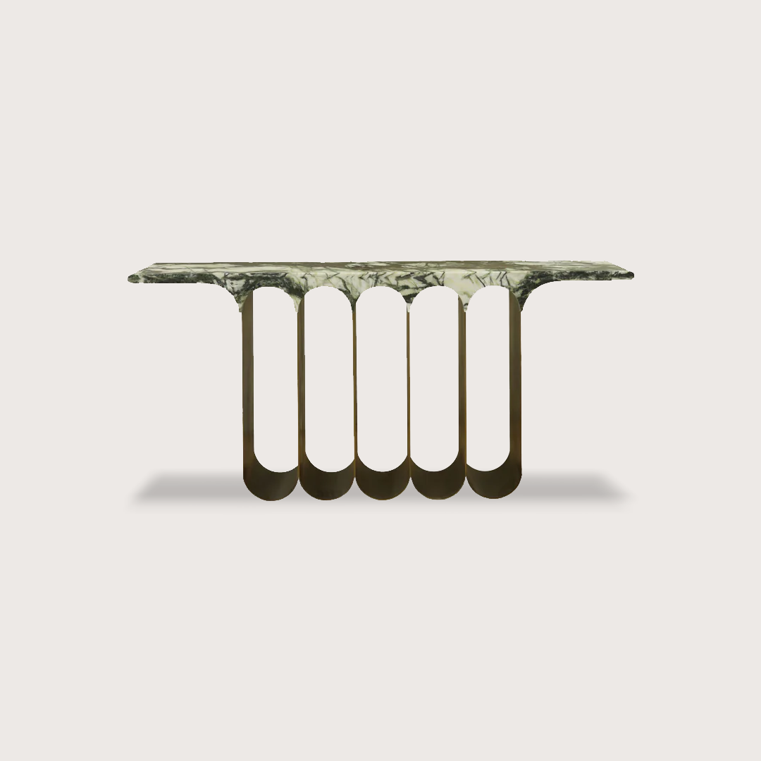 Meet the Ember Console, a blend of modern sophistication and timeless design. Its distinctive design features a multiple arched base crafted from iron, meticulously powder-coated for durability and adorned with a luxurious brass finish. Topping off this masterpiece is a matte black marble or Jade Marbles, providing a sleek and sophisticated contrast to the boldness of the base. Perfect for entryways, living rooms, or hallways, the Ember Console adds a touch of opulence and style to any space, making it a statement piece in your homedecor collection.