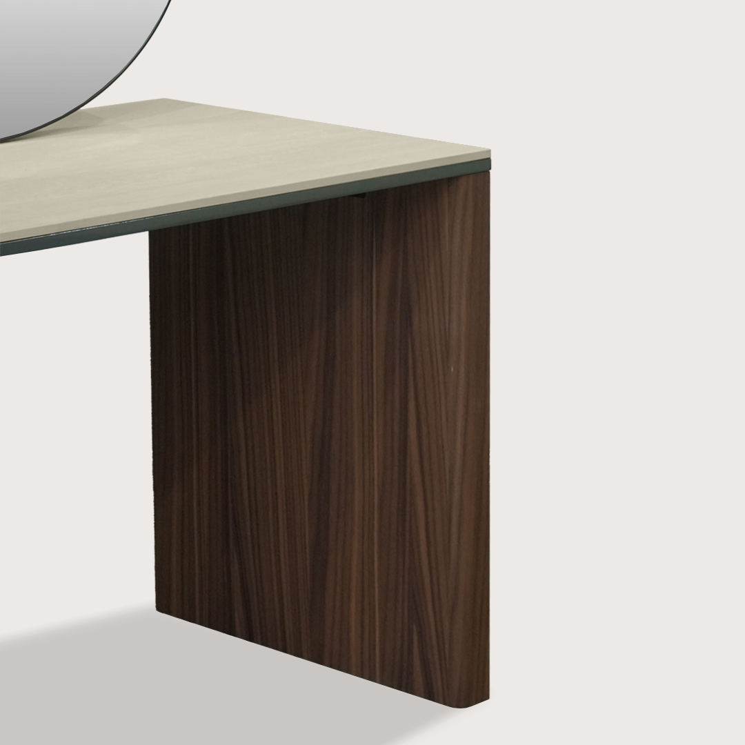 The Sydney Vanity showcases a soft curved edge and smart functionality. Designed with built-in swing-out storage and a rotating mirror, it’s finished in a green polyurethane with a porcelain travertine top and a nuetral timber for a modern, sophisticated touch.