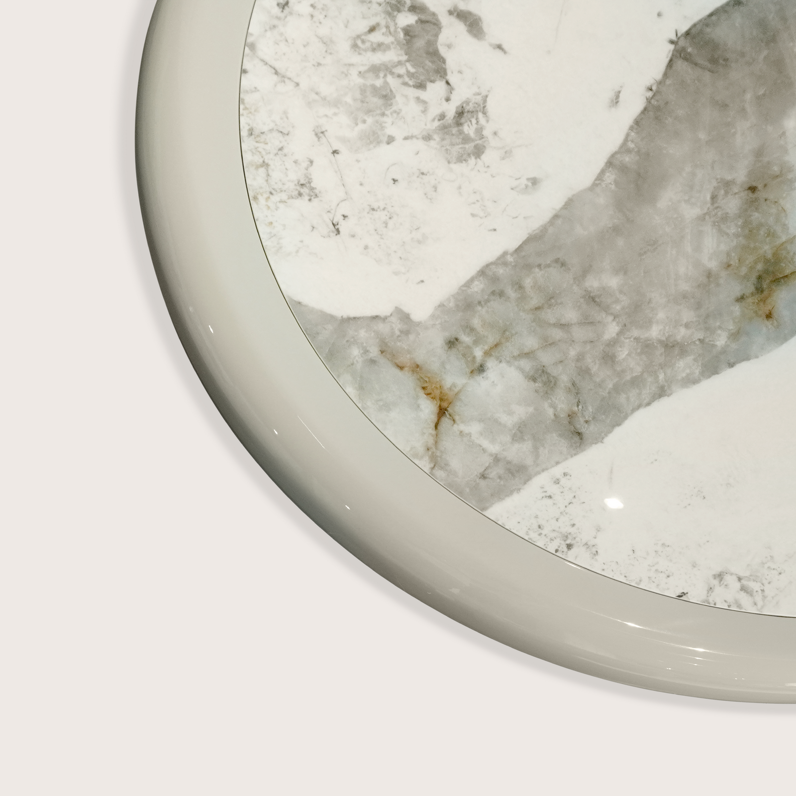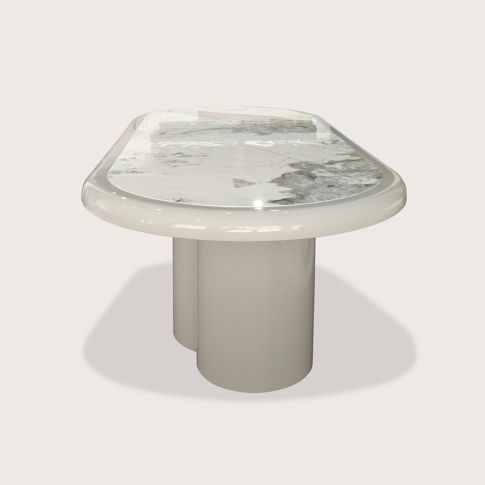A bold and sculptural dining table featuring a textured stone top and robust pillar legs. Its striking form and organic finish bring timeless elegance to any dining space.